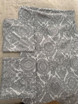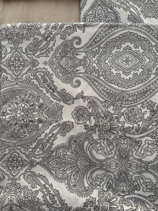 Juego de funda nórdica con un diseño estampado cachemira en tonos grises y blancos. Incluye dos fundas para almohada a juego. NO NECESITA PLANCHAR, la tela no se arruga!!! - Medidas funda nórdica: 220x240 cm. - Medidas fundas de almohada: 50x75 cm (aproximadamente). - Material: Poliéster.