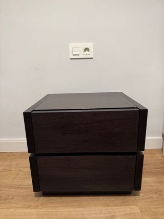 Mesa de noche con un diseño moderno y elegante. • MADERA PESADA - Acabado en madera oscura. - Dos cajones amplios para almacenamiento.