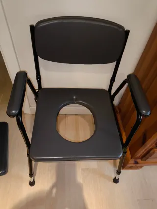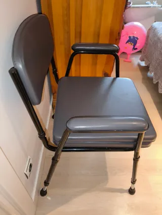Silla alta para baño, diseñada para ofrecer soporte y comodidad. Su altura es ajustable para adaptarse a diferentes necesidades. - Estructura metálica y de plástico. - Color gris y negro.