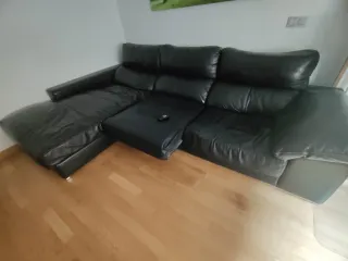 Sofá de piel negra con chaise longue, amplio y muy cómodo. Asientos deslizables con mando a distancia y chaise longue con arcón de almacenaje. Asientos mullidos y respaldo confortable. En buen estado. Se vende por cambio de mobiliario. No se hace envío. Recogida a cargo del comprador.