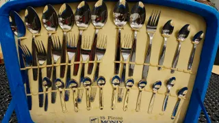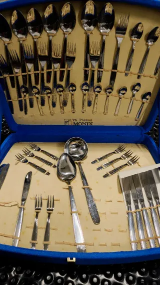 Set de cubertería de 24 piezas de la marca PINTINOX. - Diseño elegante y moderno. - Apto para lavavajillas. -Son de acero inoxidable. - Signos de desgaste de la caja , al aver estado guardado,por eso el precio.