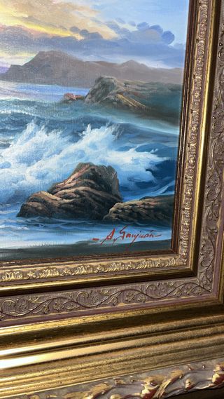 Precioso cuadro de paisaje marino con un marco detallado. - Tonos azules y dorados. - Marco de metal y madera.