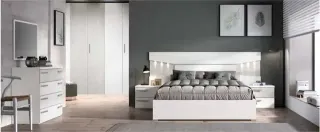 MEDIDAS: 259 cms x 201 cms. Colores de la composición: Polar/Nebraska Galería Shade con leds 220 x 65. Bancada somier elevable base tapizada 150 x 190. 2 Mesitas Tapa 30 de 3 cajones de 50,4 A x 43,6 H x 42F. Comodín Tapa 30 de 4 cajones de 100,4 A x 82,4 H x 42F. Marco con luna 60 x 90. Armario de 4 puertas de 178,8 A x 218 H x 56,6F. Posibilidad de elegir otras combinaciones de colores y tiradores (consulte fotos en los muestrarios) Consulte con nuestras especialistas nuestra amplia gama de nuestros colchones para completar su composición. Garantia de 2 años. Financiamos 12 meses sin intereses. Consultas por whatsapp al 672699522