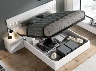 Cama completa con canapé y colchón, prácticamente nueva. Ideal para dormitorio individual o de matrimonio. - Estructura de madera. - Incluye canapé y colchón. - Color blanco y madera clara.