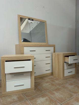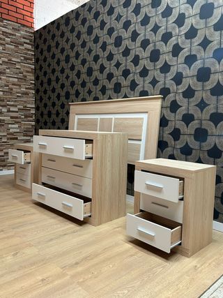 ☎️680*558*196 Se vende conjunto completo de dormitorio matrimonial compuesto por: 🛏️ Cabecero moderno en color roble claro con paneles blancos 🗄️ Cómoda sinfonier grande con 5 cajones amplios 🛋️ Dos mesitas de noche con 3 cajones cada una Diseño moderno y elegante, en madera color roble claro combinada con blanco mate, perfecto para dar luminosidad y estilo nórdico al dormitorio. Muebles nuevos, de gran capacidad y excelente calidad, ideales para decoración minimalista o contemporánea. 📦 Estado: nuevo