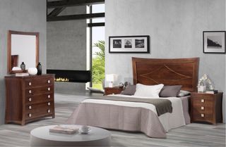 Elegante cama de matrimonio con un diseño clásico y robusto. Fabricada en madera de alta calidad, muy resistente y cuidada. Diseño curvo en el cabecero y piecero. Incluye somier. *Posibilidad de adquirir dormitorio completo.