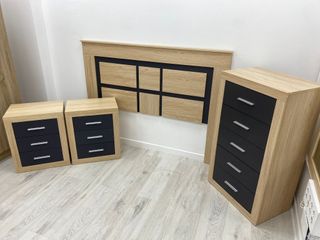 680*558*196 ☎️ Conjunto de muebles de dormitorio matrimonial o dormitorio juvenil con un diseño moderno y elegante. - Cabecero de madera con detalles en negro. - Dos mesitas de noche con cajones. - Sinfonier Cómoda alta con varios cajones. ✅2 Colores disponibles