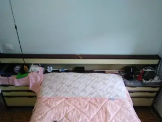 Se vende conjunto de dormitorio completo. - Cabecero con mesitas de noche integradas e instalación eléctrica para iluminación nocturna. - Cama de matrimonio de 135cm. - Colchón incluido.