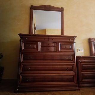 Se vende dormitorio de matrimonio completo. Consta de dos mesillas de noche de 4 cajones y cristal de protección (63x45x45) 45€ cada una, 1 cómoda (1,06x45x90) de 5 cajones también con cristal de protección de 80€, un espejo (1,05x59x5) por 50€, 2 lámparas de mesa de forja beige con una altura de 50 cms por 25€ cada una y un cabecero para cama de 1,50 y una altura de 1,02 cms por 60€. Todo en madera de cerezo.