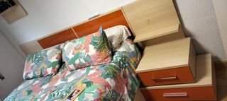 Dormitorio de matrimonio madera. - Cabecero de madera adaptable para pared de entre 251,5 -271cm. altura maxima 109cm - Mesitas de noche a juego. - Bancada con capacidad de hasta 8 cajas de ikea de 45l. para colchon de 135 x 180cm. - Se regala colchon. No se incluye decoracion de la gabitacion. La bancada se desmonta en dos para trasportarla. 2 piezas de 2mx 70cmx25cm. Las mesitas y la base son desmontables por cajones e inrercambiables en altura y colocacion.