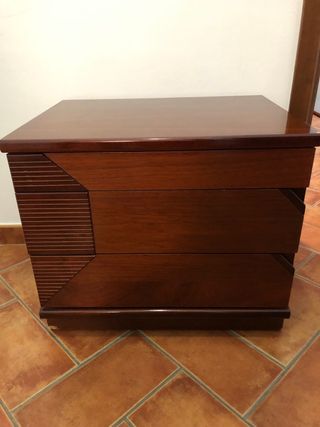 2 mesitas de madera con tres cajones. 1 sinfonier de 6cajones de 50cm d ancho 1 cabecero de 2m de largo 1canape de madera con cajones a ambos lados Está en buen estado, aunque presenta algunas pequeñas marcas de uso en la superficie. mas fotos y medidas preguntar.... urge retirar, precio negociable, tambien cambio por algo que me interese