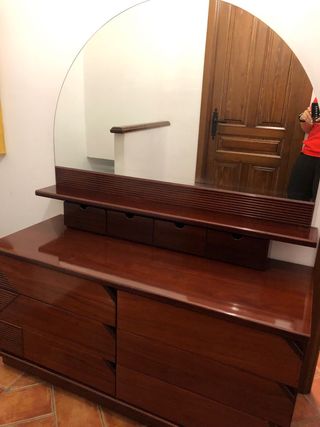 Dormitorio de matrimonio de 7 piezas. Es de madera color nogal oscuro. Está en buen estado de conservación. Piezas: - Armario de 5 puertas (interiores totalmente montados y en buen estado, se puede observar ambas cosas en las fotos). Solo el filo del hueco central con estantes en peor estado (también mostrado en foto). - 2 mesitas de noche con 2 cajones. - Cómoda alta con 4 cajones. - Baúl. - Cómoda baja con 2 puertas (2 pequeños picotazos en una de las puertas y alguna zona desgastada en la zona superior de la cómoda, todo mostrado en fotos). - Espejo. Todas las medidas en la foto final (en mm). A recoger en zona Viapol.