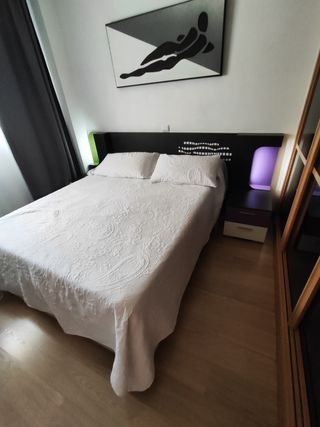 Dormitorio de matrimonio compuesto por cama de 1,35 m, cabecero con almacenaje, mesillas y cómoda con espejo. No incluye colchón. En buen estado, alguna pequeña marca de uso en las mesillas. Anchoxaltoxfondo mesilla: 50x47x42 Anchoxaltoxfondo cabecero: 190x84x17 Anchoxaltoxfondo cómoda: 120x190x42 Las mesillas se meten por debajo del cabecero, como se aprecia en las fotos. La anchura total aproximada entre cabecero y mesillas es de 250 cm