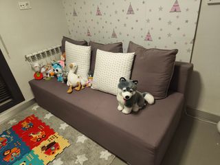 Sofá cama de tela en buen estado. Ideal para espacios pequeños. Se pliega fácilmente para ahorrar espacio. - Perfecto para sala de estar o dormitorio. - Incluye 3 cojines - Se convierte en cama de matrimonio - Espacio para almacenaje