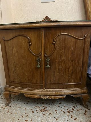 Vendo pareja de mesitas de noche de estilo clásico, a juego con tocador, espejo y cabezal de cama. Diseño elegante con frentes curvos, patas estilizadas y tiradores metálicos ornamentados. Incorporan tapa de cristal, muy práctica para proteger la superficie. Cada mesita dispone de 2 cajones amplios, ideales para dormitorio. Muebles bien conservados, con bonitos detalles decorativos y el encanto propio del paso del tiempo (ver fotos). 🪑 Estado: buen estado general, con señales normales de uso. 🛏️ A conjunto disponible: tocador con espejo y cabezal de cama de matrimonio. 📦 Se venden las dos juntas.