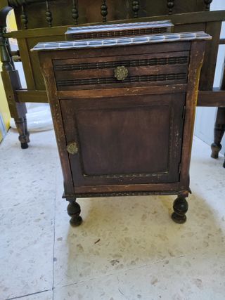 Conjunto de dos mesillas de noche con un diseño elegante. - Acabado en madera oscura. - Encimera de mármol. - Tiradores decorativos. Se encuentran en perfecto estado, en una de ellas el tirador de la cajonera está despegado pero se puede arreglar. Se podrían venden por separado: unidad 25€ Dormitorio - vintage - estilo retro - habitación - matrimonio - decoración