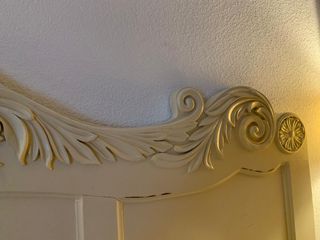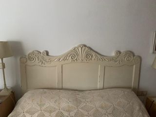 Vendo precioso y original cabecero de cama de matrimonio valido para camas de 135 y 150 cm, con un diseño clásico y adornos tallados florales. Ideal para decorar dormitorios de estilo shabby chic o vintage. 📏 Medidas (ver fotos): Ancho: 160 cm (aprox. ancho estándar cama 135-150 cm) Alto máx.: 123 cm (aprox) 🖌️ Acabado en blanco envejecido con leves señales de uso, que realzan el encanto rústico y original de la pieza. ✅ Muy buen estado estructural. 🔧 Se entrega tal cual, listo para llevar y decorar. No requiere montaje de piezas 💸 Precio: 89 €