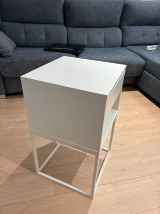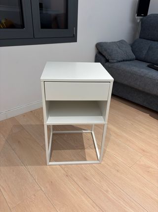 Mesita de noche IKEA VIKHAMMER en color blanco, de diseño moderno y minimalista. Cuenta con un cajón amplio y un estante abierto, ideal para dormitorio o como mesa auxiliar. El mueble está en buen estado general, es estable y totalmente funcional. Presenta ligeros arañazos estéticos propios del uso (ver fotos), que no afectan al uso ni a la estructura. Características: - Estructura metálica - Cajón con guías metálicas - Color blanco - Diseño ligero y moderno Solo recogida en mano.