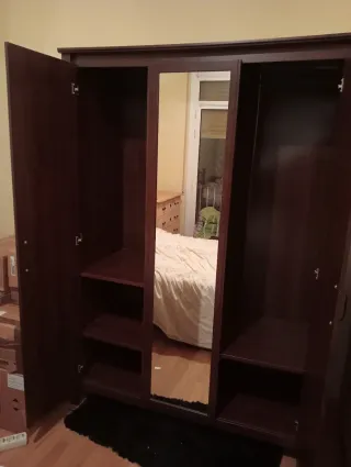 Conjunto completo de muebles de dormitorio en madera, estilo clásico, en muy buen estado y con detalles elegantes. El conjunto incluye (cm): • Cabecero 150(ancho)x125(alto) • 2 mesitas de noche con cajones (con tiradores metálicos)-33 (profundo)x50(ancho)x 60(alto) • Cómoda 45(profundidad)x114(ancho)x89 (alto) con espejo 90(ancho)x107(alto) (CAMA Y ARMARIO EMPOTRADO NO INCLUIDOS) Características: • Madera color nogal con detalles decorativos e incrustaciones • Tiradores metálicos de estilo clásico • Muebles robustos y de calidad, no son de Ikea 📌 Estado: muy bueno, con ligeras señales de carcoma en la base (ver fotos)