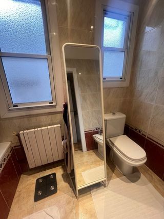 Espejo de cuerpo entero con soporte, de diseño sencillo y elegante. Ideal para dormitorio, vestidor o baño amplio. Su formato vertical permite verse de cuerpo completo y aporta amplitud y luminosidad al espacio. Es estable, funcional y fácil de mover. En la parte trasera dispone de soportes para colgar toallas o ropa, lo que lo hace aún más práctico. Ocupa poco espacio y encaja bien en ambientes modernos y neutros. En muy buen estado.