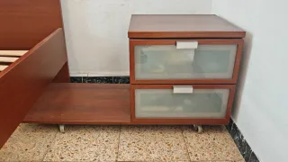 Muebles de dormitorio de Ikea. - Estructura de cama de madera clara. - Mesita de noche con dos cajones.