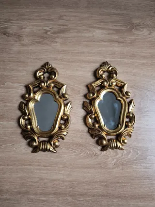 2 espejos cornucopias dorados. Ideal para un salón, dormitorio, hall o vestidor Decoración tallada súper bonita. Destacarán allí donde se coloquen miden 27*15'5cm marco. La luna del espejo mide 10'8*7cm. En buen estado VDV3240 victoriano imperio antigüedad boulle Sévres antiguo retro vintage rastro lienzo subasta clásico Borgia Conti hanbel Ikea sklum portobello midcentury Hollywood regency becara maison du monde espejito veneciano tapiz zara kave home Jansen Luis XV XVI alpaca plata cuadro Napoleón III barroco rocalla marquetería alfombra caja virgen capilla nácar isabelina madera antigua pan de oro escudo heráldico repostero