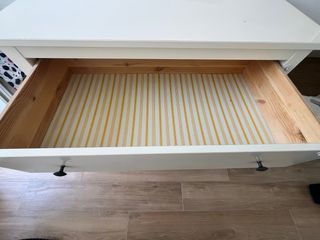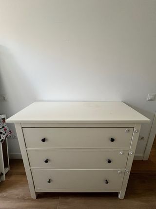 Cómoda de madera blanca de IKEA, modelo HEMNES. Tiene tres cajones. Está en buen estado, aunque presenta algunas pequeñas marcas de uso. la parte de arriba tiene como mancha amarillenta. - Perfecta para dormitorio o habitación infantil. - Tres cajones espaciosos. - Tiradores negros.