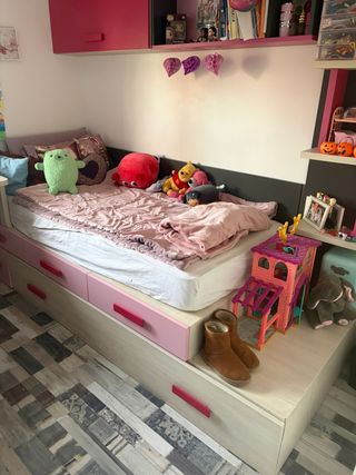 Conjunto de dormitorio infantil en buen estado. Incluye cama con cajones y peluches. - Cama con dos cajones grandes. - Frontal de cajones en color fucsia. - Peluches incluidos.