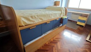 Se vende habitación juvenil completa, ideal para optimizar el espacio. - Cama con cajones y cama inferior. - Mesilla de pared. - Mesa escritorio con cajonera. - Mueble estantería. - 2 muebles/cajonera independientes. - 2 estantes de pared. - 2 colchones. Precio negociable.