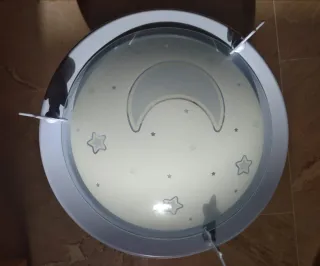 Preciosa lámpara de techo para habitación infantil. Ideal para crear un ambiente mágico y acogedor. - Diseño con luna y estrellas. - Color azul claro. - Perfecta para dormitorios infantiles. De segunda mano pero en perfecto estado.