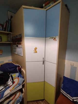 Dormitorio infantil con doble litera abatible para colchón de 200x90cm. Dispone de dos altillos y escritorio integrado. Armario de 238x104cm con 4 cajones y otro armario con puerta ciega de 238x85cm con 2 baldas.Estantería azul de 19cm con 5 baldas. Habría que desmontarlo. No hago envíos.