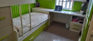 Conjunto de muebles para dormitorio infantil. - Cama con cajones integrados. - Escritorio a juego. - Estanterías decorativas. -Dos camas de 90 Costo en su día 2500€ y está sin apenas uso. Habría q desmontarlo . Escucho ofertas o sujerencias