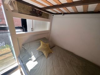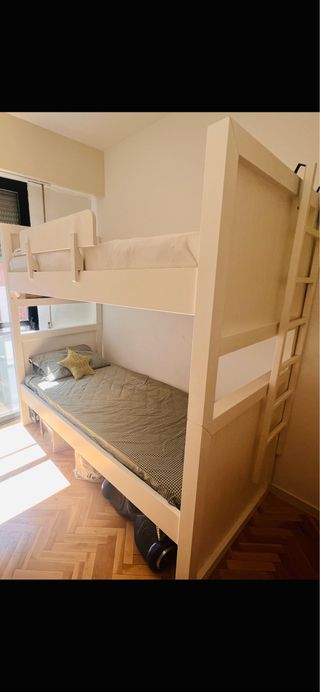 Litera compuesta por dos camas independientes de 90* 190 Material DM lacado blanco Diseño de la firma Amelia Aran Se venden juntas Se incluye en el precio la venta los colchones que han tenido muy poco uso Están en buen uso salvo la pieza “quitamiedos” que se ha roto y la hemos colocado al revés ya que puede usarse ( adjunto foto) El comprador se tendría que ocupar del desmontaje y transporte