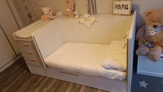 Cuna convertible con cama es una solución sencilla y práctica para que los pequeños de la casa crezcan y se desarrollen con todas las comodidades que requiere cada etapa. El módulo de la cuna mide 200x100x97 la barrera tiene forma redondeada para eliminar cualquier esquina, la conversión a dormitorio juvenil consta de una cama superior de 190x90 y una cama nido de 190x80, un escritorio de 140x60x95, un módulo estantería con dos huecos, una cajonera y una balda estantería, color madera noruega, blanco y tiradores en rosa suave. La habitación tan solo tiene un año de uso, está para estrenar, nueva 950€.