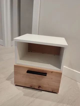 Mesita de noche con un diseño moderno y funcional tanto para dormitorios juveniles como para cualquier otra estancia. Combina acabados en blanco y madera natural para un toque cálido. Podemos utilizarla de dos formas como mesita de noche y también como una estantería, ya que se le puede quitar el cajón. - Cajón con acabado en madera y tirador negro. - Compartimento abierto superior.