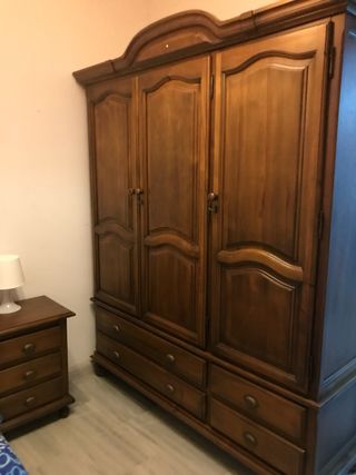 Armario, tres camas, mesilla de madera. Están impecables.