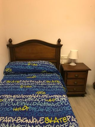 Se vende dormitorio juvenil de madera. - Incluye 2 cama individual. - Mesita de noche de madera con cajones. - Cabecero de madera con diseño curvo.