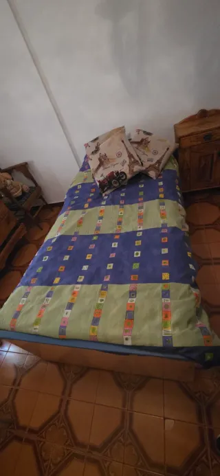 Dormitorio nido juvenil con dos camas de 90 cm x 180 , una de ellas pliega sus patas y puede guardarse debajo , mueble cabecero o para un lateral de 180x 95 con dos puertas correderas, tres baldas estanterías, un armario de 2 puertas de 200 cm de altura, 100 de ancho y 60 cm fondo , una estantería de 200 altura x 57 cm de ancho y 26 de fondo. Regalo los 2 colchones y edredón y perchero a juego No envío