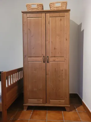 Armario de dormitorio con dos puertas y acabado en madera. - Incluye barra para colgar ropa. - Dispone de dos baldas interiores para almacenamiento adicional.