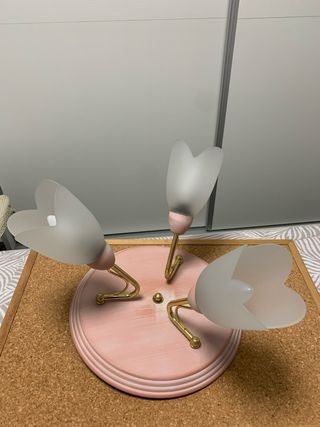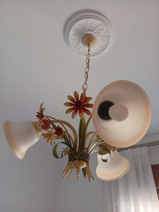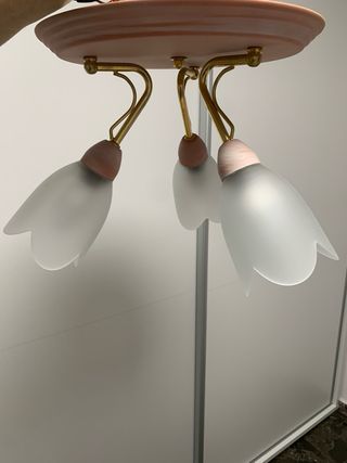 Preciosa lampara de techo para dormitorio infantil o juvenil. Tiene un diseño floral muy bonito y elegante. - Tres tulipas de cristal opalino. - Estructura metálica con detalles multicolor. - Ideal para dar un toque de luz y color a la habitación.