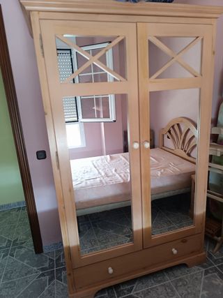 Conjunto de mueble de dormitorio compuesto por un armario y una mesita de noche. - Armario de dos puertas con diseño clásico. Tiene el cajón de abajo roto, lo tengo en casa y se podría arreglar - Mesita de noche a juego.