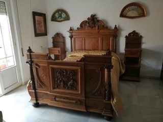 Vendo dormitorio antiguo completo de finales del siglo XIX / principios del XX, realizado en madera maciza y ricamente tallado a mano. El conjunto incluye: • Cama doble con cabecero y pie de cama tallados • Cómoda con espejo original • Dos mesillas de noche Todas las piezas pertenecen al mismo conjunto original. Muebles sólidos, de gran calidad y con mucha presencia decorativa. Estado general muy bueno, restaurado. Ideal para restauradores, anticuarios o viviendas con estilo clásico. 📍 Almería 📦 Recogida en domicilio 🚫 No se vende por piezas
