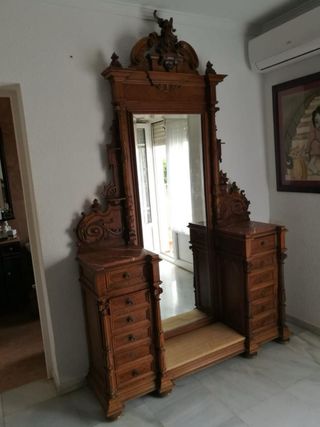 Conjunto de dormitorio antiguo del siglo XIX con detalles tallados. Cabecero 183 alto x156 ancho x15 fondo Mesita de noche 94 alto x 43 ancho x41 fondo Armario 265 alto x 130 ancho x 65 fondo Espejo con cajones 230 alto x 152 ancho x 47 fondo Silla descalzadora 71 alto x 46 ancho x 44 fondo