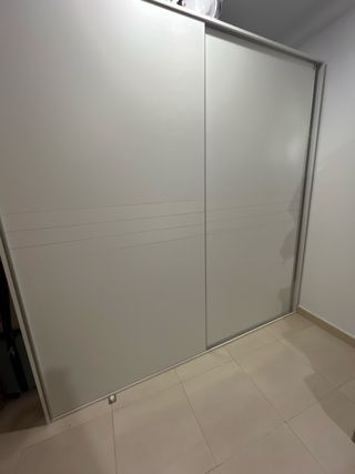 Blanco. Puertas correderas. Parte izquierda con balda de altillo y barra. Parte derecha con balda de altillo, barra y 2 cajones grandes. Mide 220 de largo, 220 de altura de y 56 de anchura.