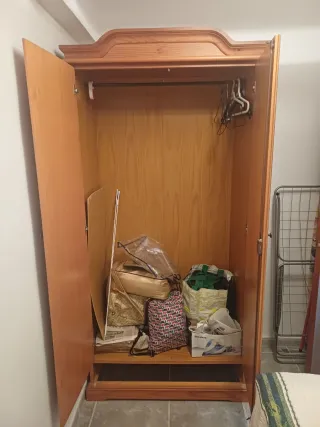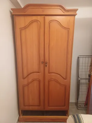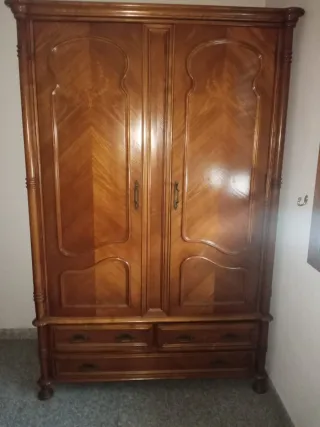 Se vende dormitorio completo de estilo clásico, en muy buen estado, pertenecía a una persona mayor y ha tenido muy poco uso. Incluye: Armario grande de madera maciza, muy robusto y con gran capacidad Cama de madera a juego, sólida y bien conservada Colchón prácticamente nuevo, limpio y sin manchas, siempre protegido Muebles cuidados, sin humedades ni malos olores. Ideal para vivienda, casa de invitados o piso de alquiler. 💶 Precio del conjunto: 150 € 📍 Recogida en mano 📩 Cualquier duda, preguntar sin compromiso