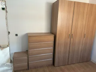 Conjunto de armarios de madera para dormitorio. El diseño es moderno y funcional. Medida armario: 210x151x51 Medida cómoda: 80x108x48 - Acabado en madera natural. - Tiradores metálicos. - Amplio espacio de almacenamiento. -Cómoda, mesita de noche y armario de 3 puertas con lejas y colgador