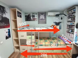 dormitorio completo con mueble cama(dos camas) sin colchon 202,5x97x74) , disspone de dos cajones amplios rodantes de almacenamiento en el mueble cama y otro mas pequeño tras cabecero con ruedas e integrado en la mesa de estudio. La mesa de estudio (298x32( a nivel cabecero)50zona de estudio)x78)con cristal protector. dispone de mueble con 4 cajones . Por otro lado ademas dispone el conjunto de un mueble estanteria (162x110,5x28,5) A RECOGER EN DOMICILIO. Cama desmontada