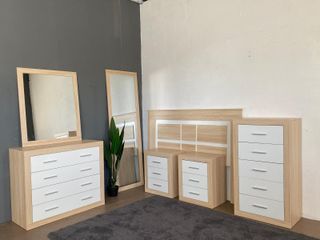Conjunto dormitorio completo: Armario Cabecero 2 Mesitas Comoda Sinfonier Espejo cuadrado Espejo largo (CANAPES Y COLCHONES DISPONIBLE) NO INCLUIDO EN EL PRECIO - Totalmente nuevo. - Precio accesible. - Ofrecemos envíos, pagas en casa.