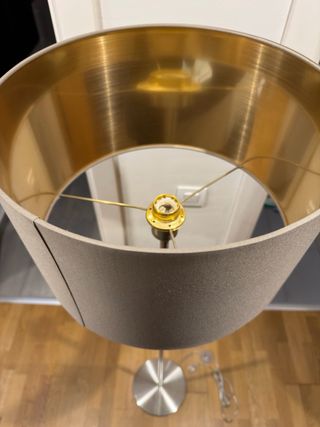 Vendo lámpara de pie elegante de estilo moderno, perfecta para salón, dormitorio o despacho. El interior dorado del plafón crea una luz cálida y muy acogedora. Está en buen estado y funciona perfectamente. Su diseño combina muy bien con decoraciones modernas, minimalistas o nórdicas. Medidas: • Altura: 150 cm • Diámetro base: 25 cm • Diámetro del plafón: 38 cm Características: • Base metálica estable • Pantalla exterior en tono gris/taupe e interior dorado • Interruptor en el cable • Luz muy agradable para ambiente Ideal para iluminar un rincón del salón o junto al sofá. Entrega en mano o envío.