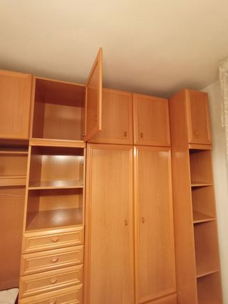 Muy bien cuidado en un estado excelente. Solo se vende por mudanza. Conjunto de muebles de dormitorio en madera clara, ideal para optimizar el espacio. Colchones, cama cajoneras, armarios, estanterías, mesas de estudio - Armario grande con puertas de lamas. - Mueble superior con estantes y puertas. - Estantería abierta. - Armario auxiliar con puertas de lamas.